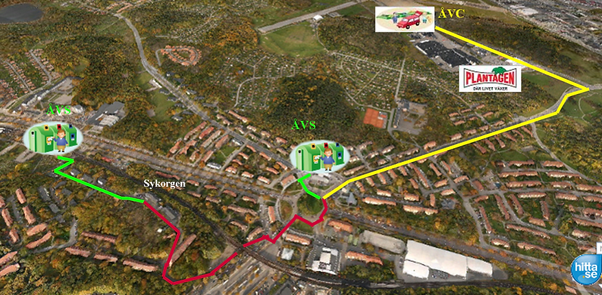 De tre sopbehållare bortom stora bilparkeringen är till för endast hushållssopor i knutna påsar som kan nyttjas av alla de boende i BRF Sykorgen 7.